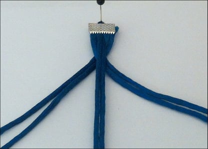 2. Posizionate il lavoro sulla tavoletta da Macramé, puntando il gancio del fermaglio con uno spillo. Incrociate i due fili laterali di ciascun lato SOTTO ai due fili centrali. Per la