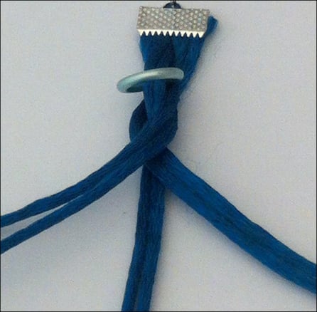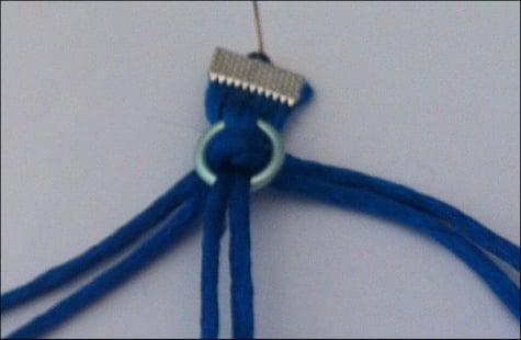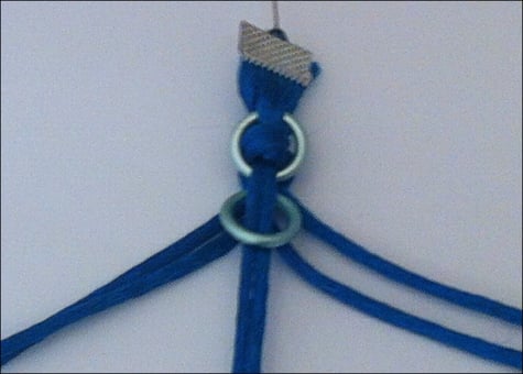 6. Incrociate i quattro fili laterali sopra ai due fili centrali. Ripassate nel secondo anelli con i fili centrali. Stringete.
