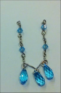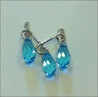 3. Agganciate tre delle briolette alle asole del pezzo tramite tre anellini piccoli come da foto. Tagliate 2 pezzi di catena da 3 maglie ciascuna. Agganciate i due pezzi di catena alle