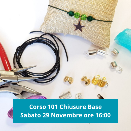 Corso ideale per chi inizia a creare bijoux e vuole imparare le 5 chiusure base per creare braccialetti e collane tra cui il nodo scorsoio, chiusura base con cavetto, come chiudere il nastro d'organza e nastro in raso.