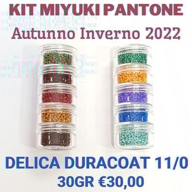 5 colori Delica 11/: DB375 (Azzurro Acqua), DB787 (Blu Lichene), DB783 (Violetta dei Prati), DB2104 (Fuoco di Drago) e DB2127 (Verde Abbondante).
